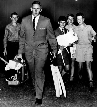 Alan Davidson leaves the SCG after a game in 1963, followed by some young fans.